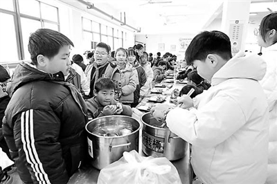 江苏省太仓市弇山小学阳光餐厅,值日生为同学打汤。计海新 摄