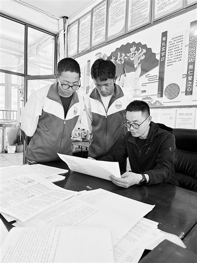 侯纯广给山南市第二高级中学学生辅导作业。学校供图