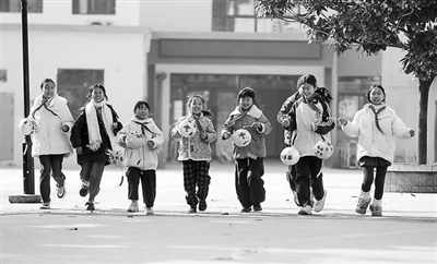 1月15日,贵州省黔西市永燊彝族苗族乡花石小学,孩子们手拿自制的迎新春花灯奔跑。周训超 摄