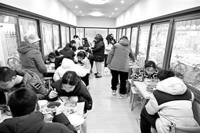 ②1月19日,江苏省泰州市姜堰区实验初级中学学生在“护学空间”享用家长送来的午餐。 新华社记者 季春鹏 摄