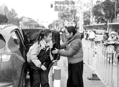 ③1月19日,志愿者在江苏省泰州市姜堰区康华小学校门前的“一米安全通道”护送学生入校。 周社根 摄(新华社发)