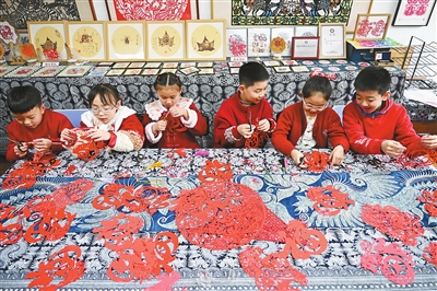 农历马年春节临近,各地张灯结彩、举办丰富多彩的民俗文化活动,孩子们以马年为主题进行剪纸创作,喜迎新春。